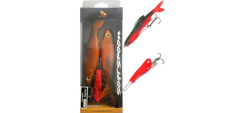Блесны Wake Soft Spoon весом 55 гр рассчитаны на поимку трофейной красавицы-щуки и, возможно, сома. Металлический изогнутый каркас вставляется в мягкую оболочку, которая детально имитирует живую рыбку. Общая длина приманки получается 15 см. Хвостовая часть не соприкасается с корпусом, потому плавно извивается. Игра колебалки раскрывается хорошо на рваной, прерывистой анимации. Хаотичные движения Soft Spoon будут напоминать больную рыбку, которая мечется в агонии. Огрузка смещена таким образом, что заставляет блесну на паузе заваливаться на бок, как умирающий малек. Можно поддергивать приманку удилищем вверх, поддразнивая хищника.