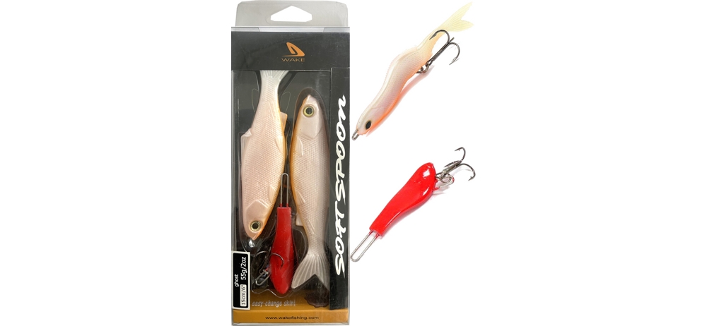 Блесны Wake Soft Spoon весом 55 гр рассчитаны на поимку трофейной красавицы-щуки и, возможно, сома. Металлический изогнутый каркас вставляется в мягкую оболочку, которая детально имитирует живую рыбку. Общая длина приманки получается 15 см. Хвостовая часть не соприкасается с корпусом, потому плавно извивается. Игра колебалки раскрывается хорошо на рваной, прерывистой анимации. Хаотичные движения Soft Spoon будут напоминать больную рыбку, которая мечется в агонии. Огрузка смещена таким образом, что заставляет блесну на паузе заваливаться на бок, как умирающий малек. Можно поддергивать приманку удилищем вверх, поддразнивая хищника.