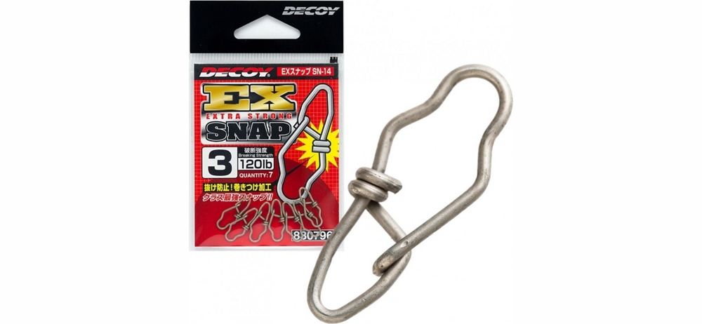 Застежка Decoy SN-14 Ex Snap разработана производителем в 2019 году и сразу же получила звание самого прочного карабина по соотношению габаритов к максимально допустимой нагрузке. Особая V-образная форма изделия и применяемый металл способствуют высокой надёжности, но даже при запредельных нагрузках застёжка не разгибается, а, наоборот, затягивается, сохраняя целостность снасти. Изгиб, в который заправляется ушко приманки, имеет увеличенный размер, что способствует лёгкой и быстрой замене блесны или воблера на рыбалке.