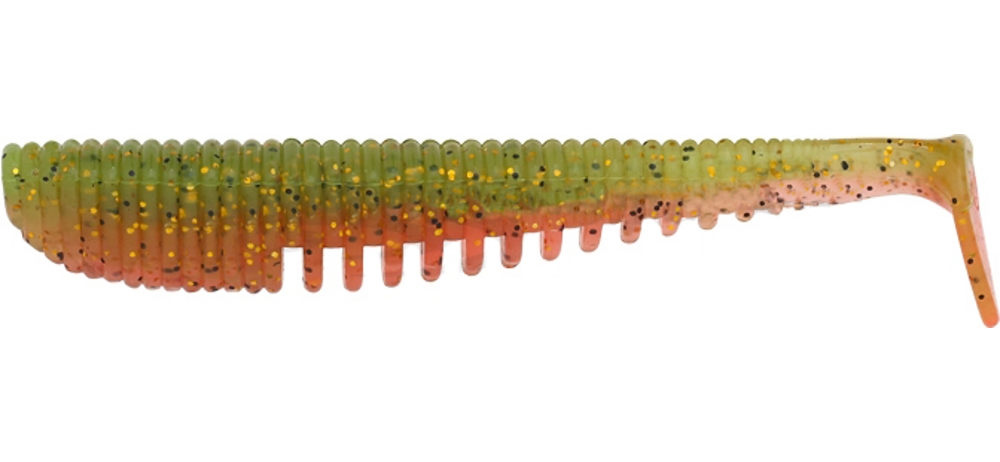 Геометрия тела напоминает небольшую рыбку. Обеспечивает динамичные колебания. Боковые «ребрышки» обогащают игру приманки, а внутренний полый канал в теле придает дополнительную гибкость и упрощает монтаж любой (Jig Head Rig, Texas Rig, Carolina Rig, Terminal Rig, Drop Shot Rig, Double Hook Rig), даже очень сложной оснастки.