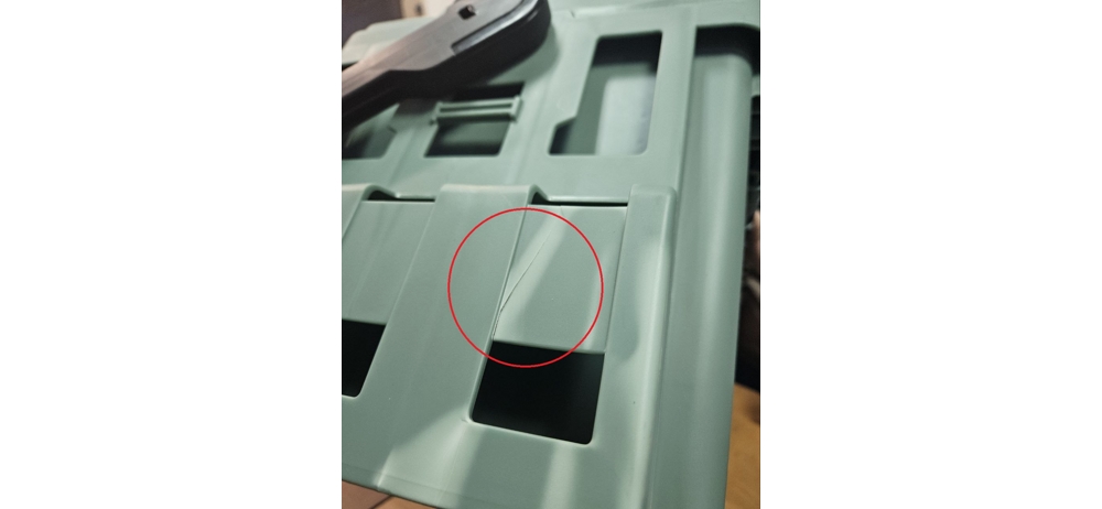 Дефект : на боковом держателе имеется трещина. На эксплуатацию не влияет. Сам ящик целый.См. фотот №2.