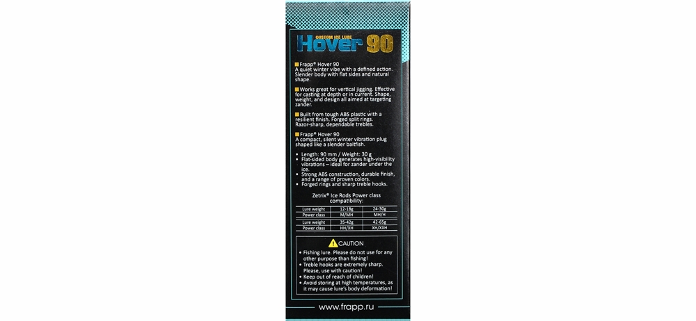 Frapp Hover — выбор для ситуаций, когда хищник реагирует на активные, но при этом тихие приманки, сочетающие компактность, продолговатый профиль, реалистичную форму и деликатную игру. Может использоваться как при ловле в отвес со льда, так и в заброс. Благодаря удлиненному телу и схожести с мелкой прогонистой кормовой рыбкой Hover особенно эффективен при ловле судака. Подходит также и для охоты за щукой, в том числе на участках со средними и большими глубинами. Отлично сочетается с современными снастями для ловли вибами в отвес и обеспечивает высокую результативность при ловле осторожного трофейного хищника.