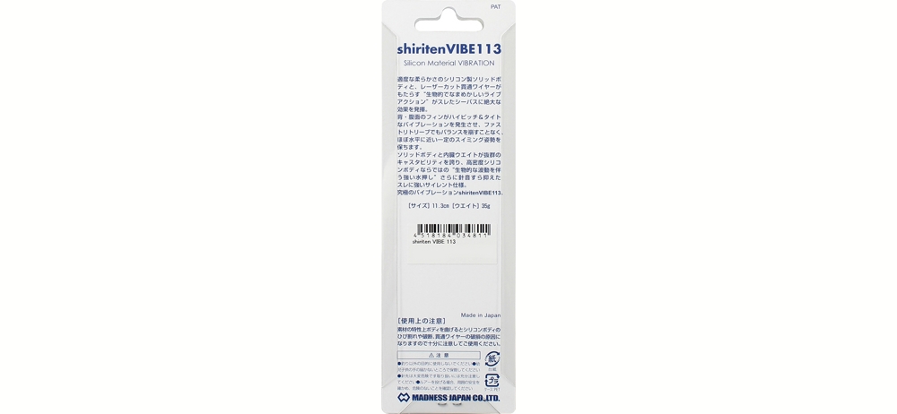 Madness Shiriten Vibe 113 - это одна из разновидностей приманки данного семейства вибов, в размере 113 мм и весом 35 гр. Помимо данной модели имеется еще несколько типоразмеров данного воблера, меньшего размеров.