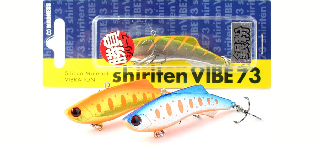 Madness Shiriten Vibe 73 – покрытый силиконом виб с выделяющейся средней частью, которая задаёт ему мощную и устойчивою среднеамплитудную игру, в то время как уплощённое с боков тело заставляет виб покачиваться и планировать при сбросе. Прекрасно привлекает активную рыбу с большого расстояния, а благодаря своему компактному размеру с успехом применяется для ловли широкого спектра хищных рыб, начиная с прудовой форели, заканчивая щукой и судаком.